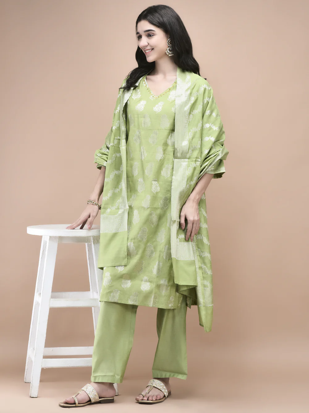 Women Cotton Jacquard Green Woven Kurta Comfort Pant Dupatta