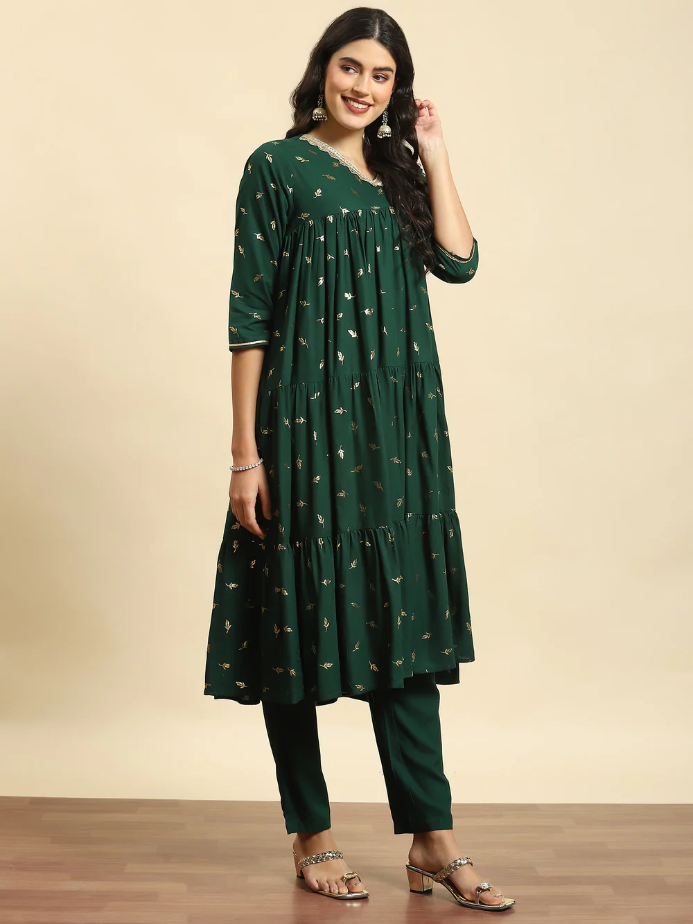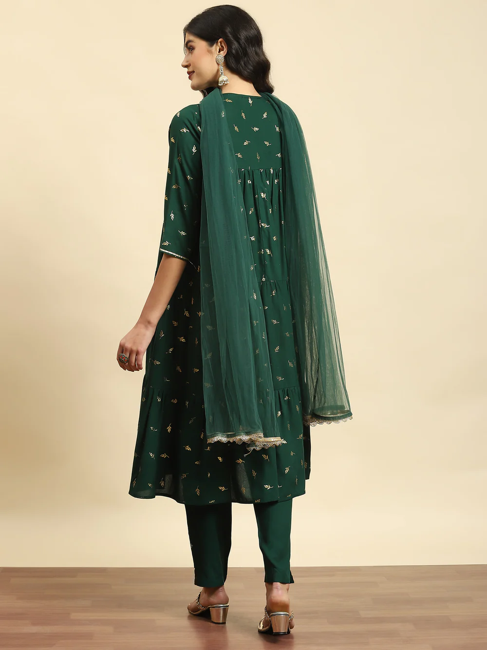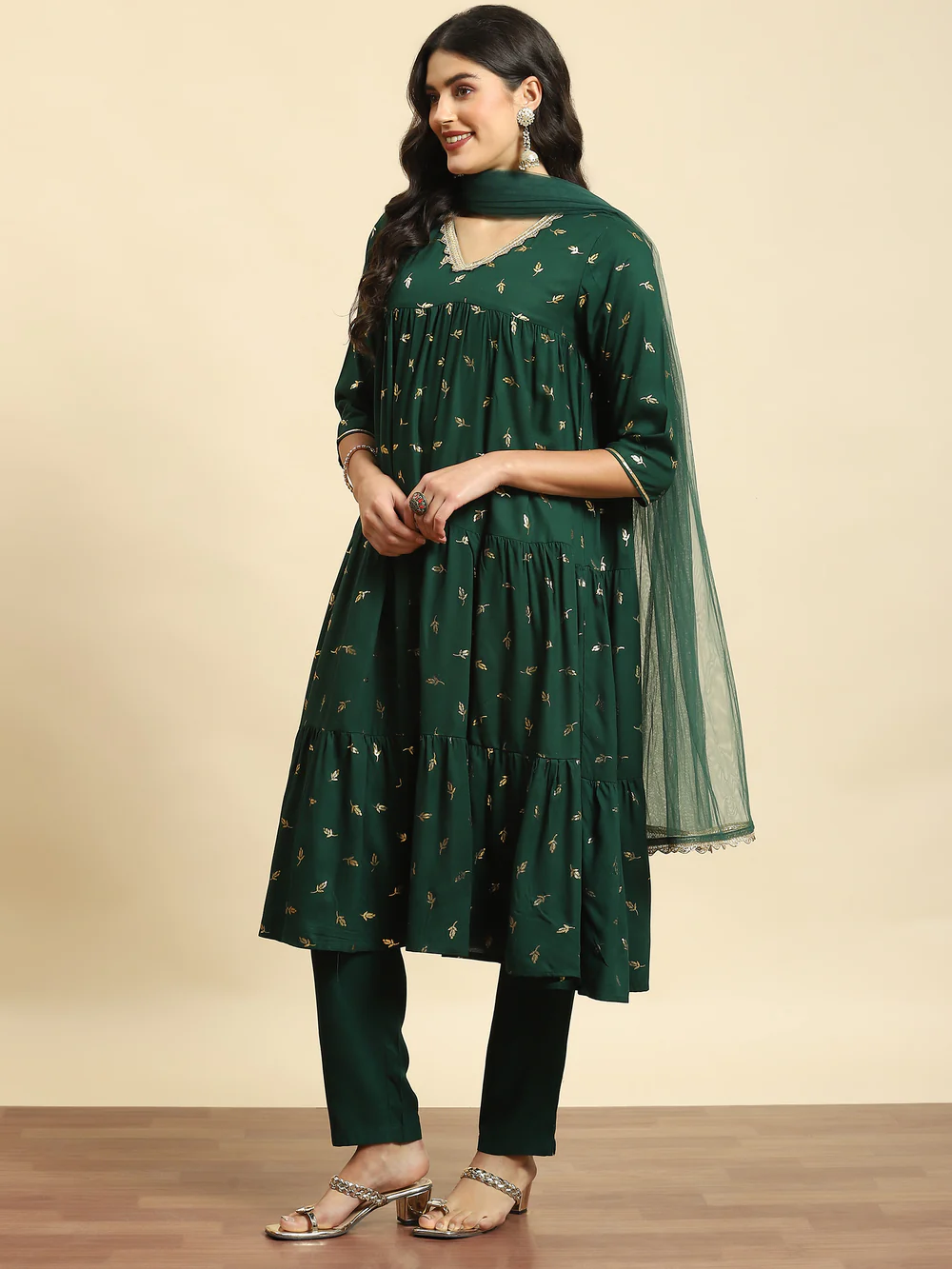 Indulge in the enchanting allure of our Green Floral Print Kurta Trouser Dupatta set ? a masterpiece designed for both family gatherings and festive occasions. The kurta, adorned with a delightful floral print, features a flattering v-neckline and 3/4-sized sleeves, ensuring a blend of sophistication and comfort. Crafted from the luxurious Liva fabric (rayon), the kurta and trouser showcase a tiered silhouette, adding a touch of graceful movement to your ensemble. The accompanying net dupatta, also embellished with floral motifs, adds an ethereal charm. Elevate your style with this ensemble, where the fusion of elegance and comfort creates the perfect wardrobe essential for your special moments. Shop for this outfit from SHREE right away!