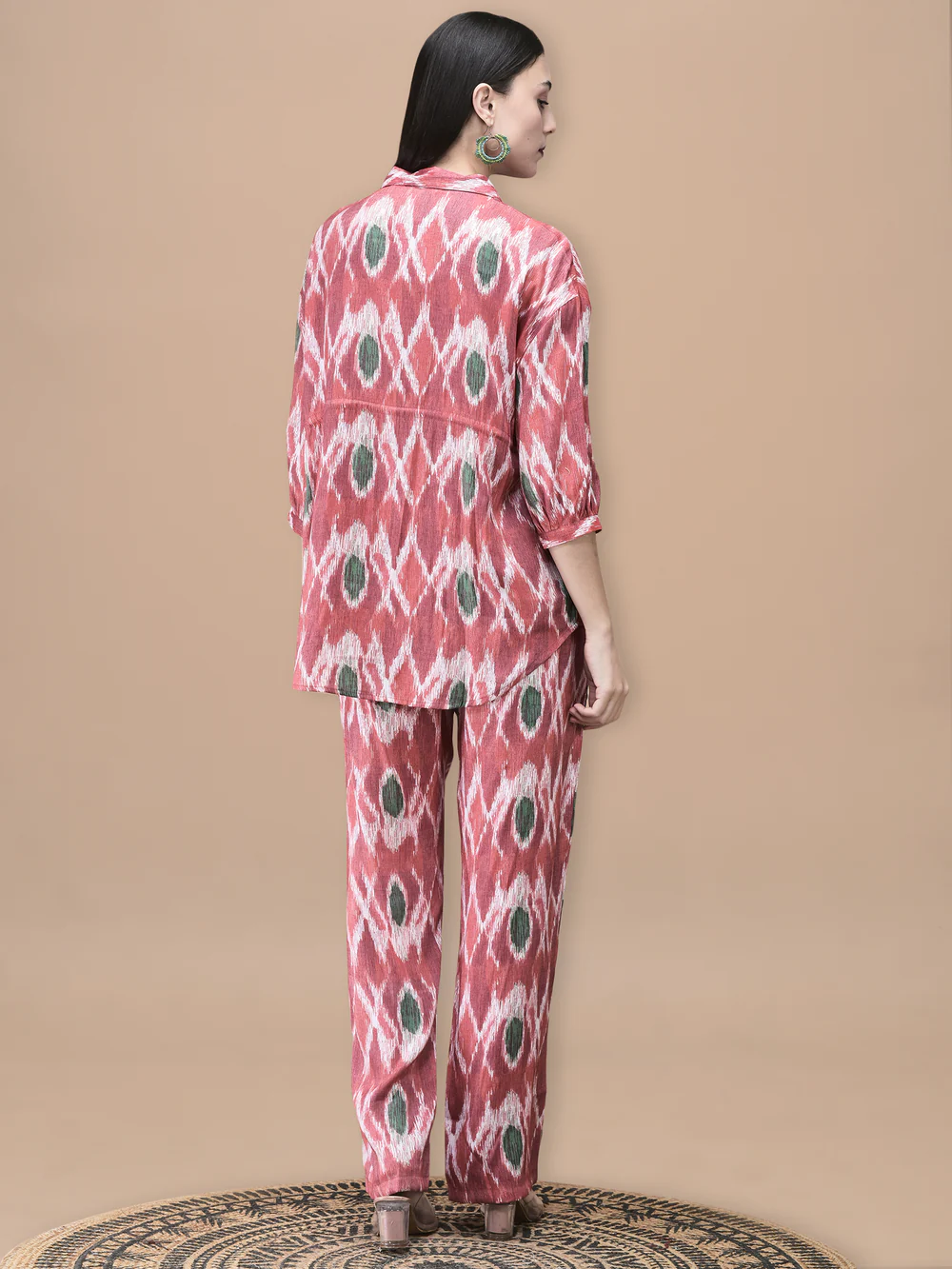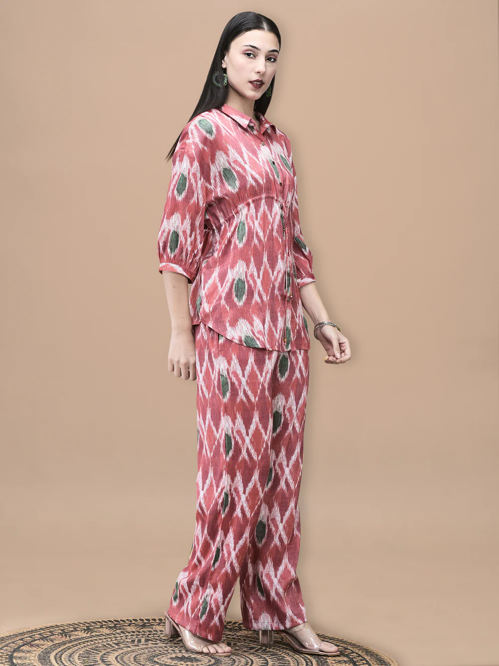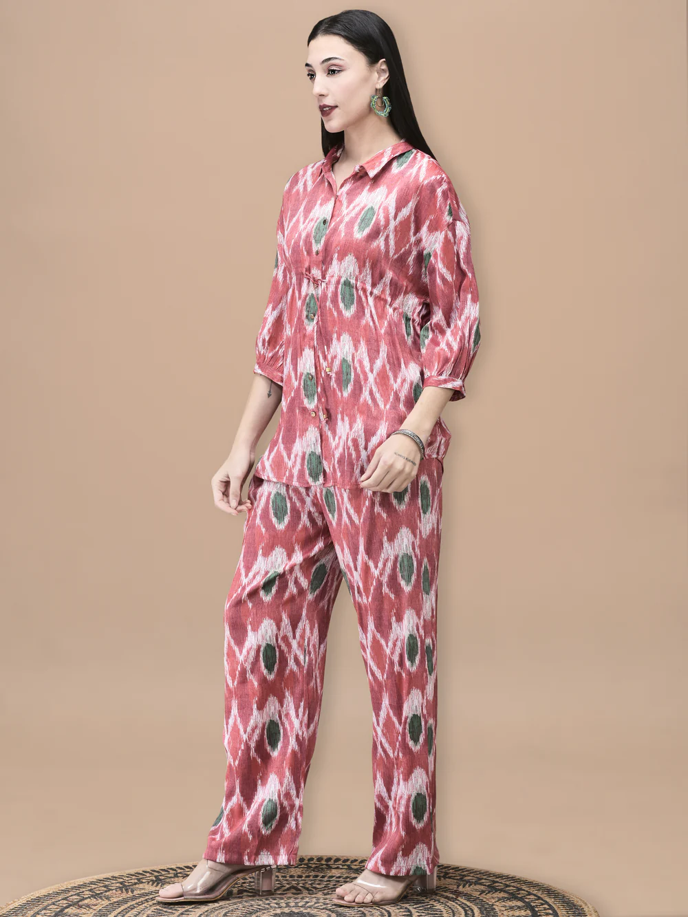 This women’s co-ord set features a red Liva fabric adorned with an abstract print, combining contemporary design with comfortable wear. The breathable Liva material offers a soft texture and excellent drape, while the coordinated pieces provide a cohesive and stylish look. Perfect for those seeking modern elegance with effortless comfort.