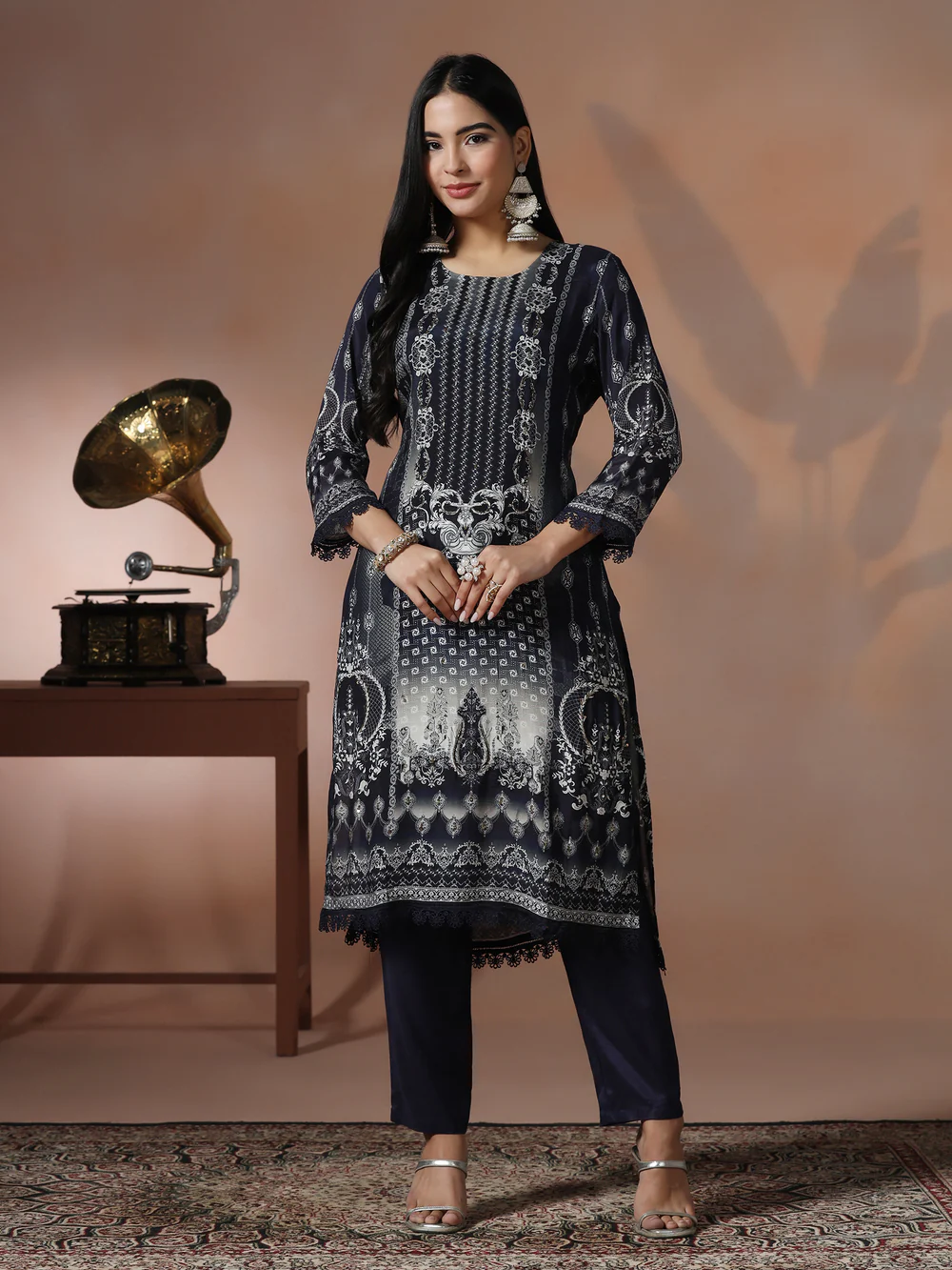 Women Viscose Muslin Blue Printed Kurta Comfort Pant Dupatta